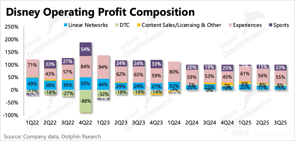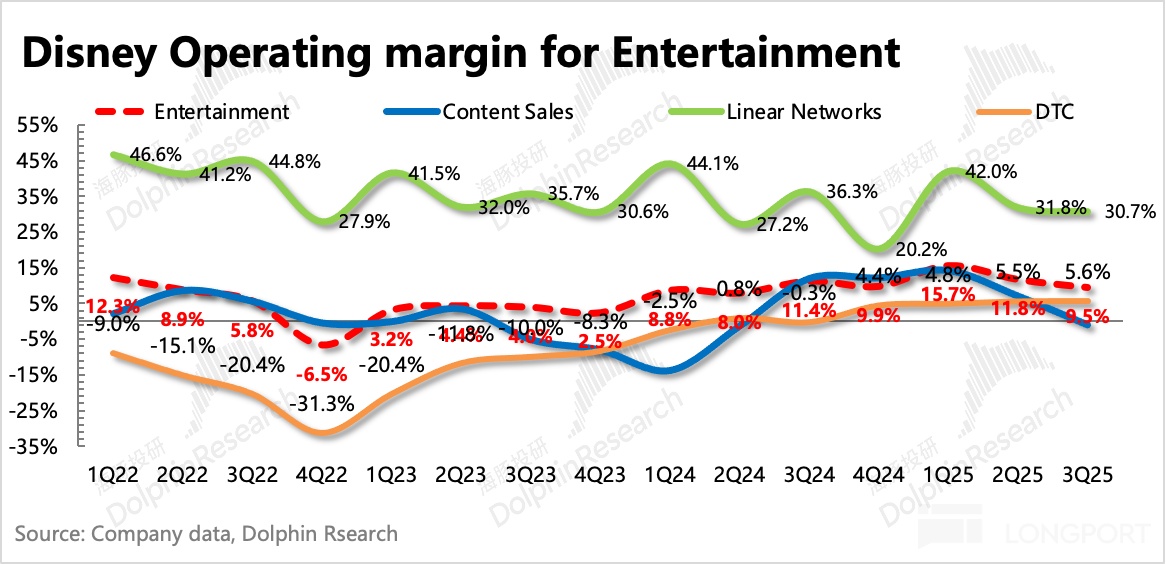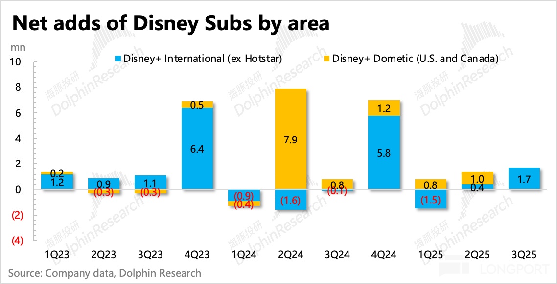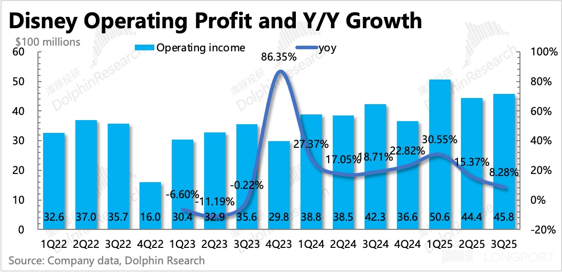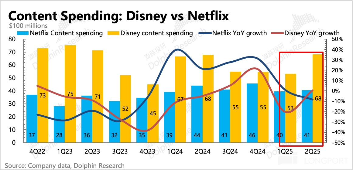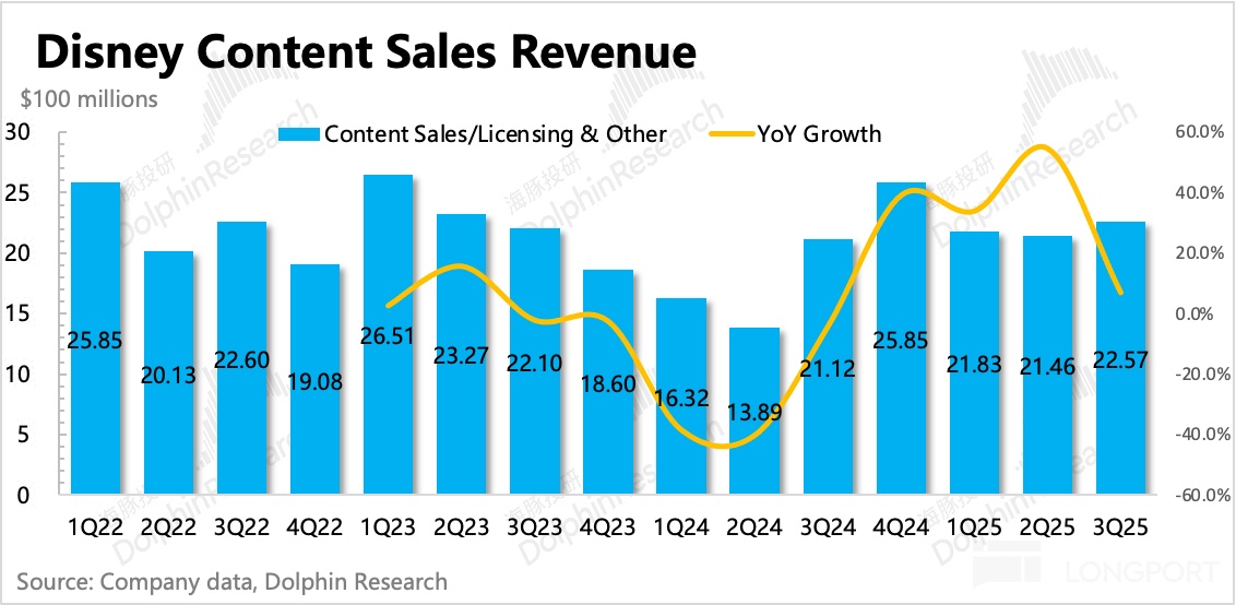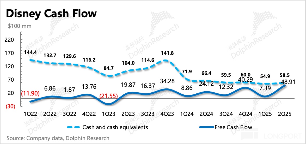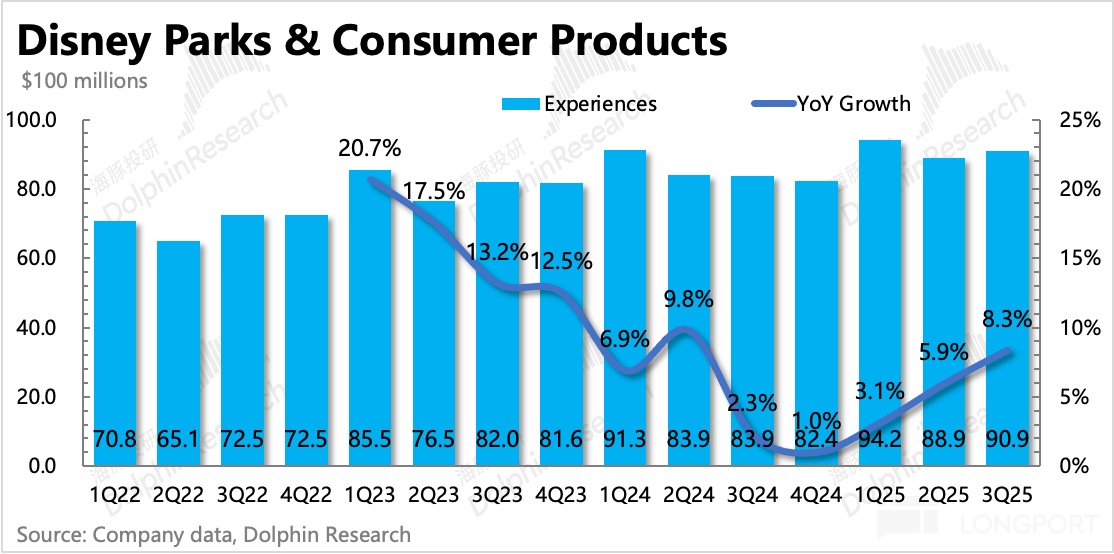 目前而言迪士尼仍然處於內容週期,本季度電影上映的主要是《Elio》、《Thunderbolts*》以及《Lilo & Stitch》,票房都還可以,但去年同期是全球票房第一的《Inside Out 2》,因此增長承壓以及變現效率同比下降。