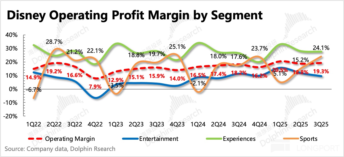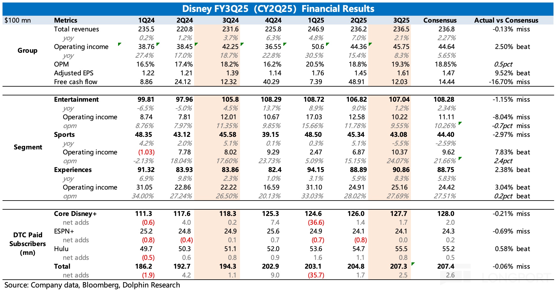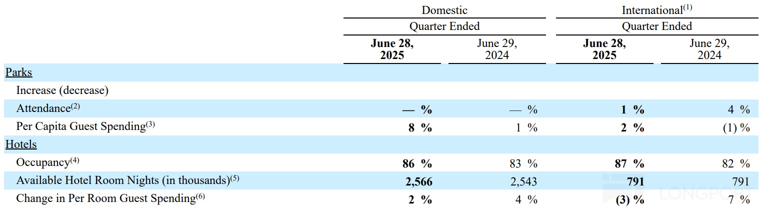 DIS 2025 財年第三季度(CY25Q2)業績。三季度業績整體在公司預設的向好趨勢上,但和預期相比,好壞參半。績後市場的負面反饋,主要是對指引上調幅度不滿帶來。