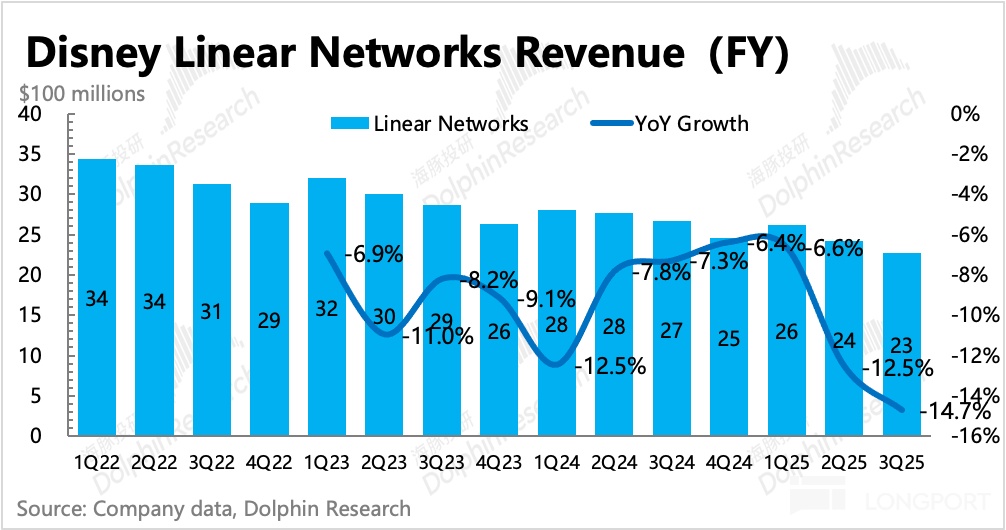 作為蹺蹺板的兩端,流媒體發展火熱的同時,傳統媒體的老業務自然不能獨善其身。隨着傳統媒體趨勢性衰敗,流媒體對迪士尼來説不能算是完全意義上的增量了,而有很大一部分是在彌補傳統渠道的沒落。
