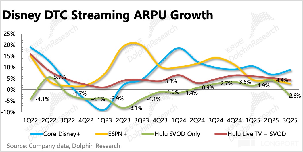 3. 體育關注 ESPN 新版本:三季度體育業務增長持平,略低於預期。除了本身收視率下滑導致增長緩慢外,印度 Star 重組影響(剝離後體現在投資收益中)也在週期內。8 月 21 日旗艦版 ESPN+ 將發佈,預計會提振用户訂閲和廣告收入。