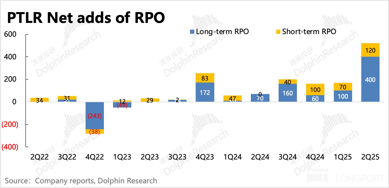 二季度 Palantir 剩餘合同額 24.2 億美元,環比增加了 5.2 億,優於上季度。其中,長期合同淨增較多。