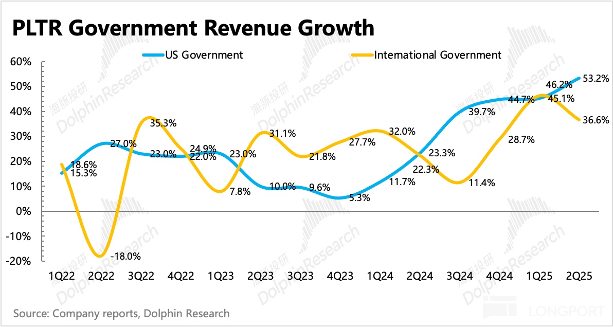 二季度政府客户收入同比增長 49%,增長主力依然是美國政府,國際政府增速略微放緩,但依然是高增長。