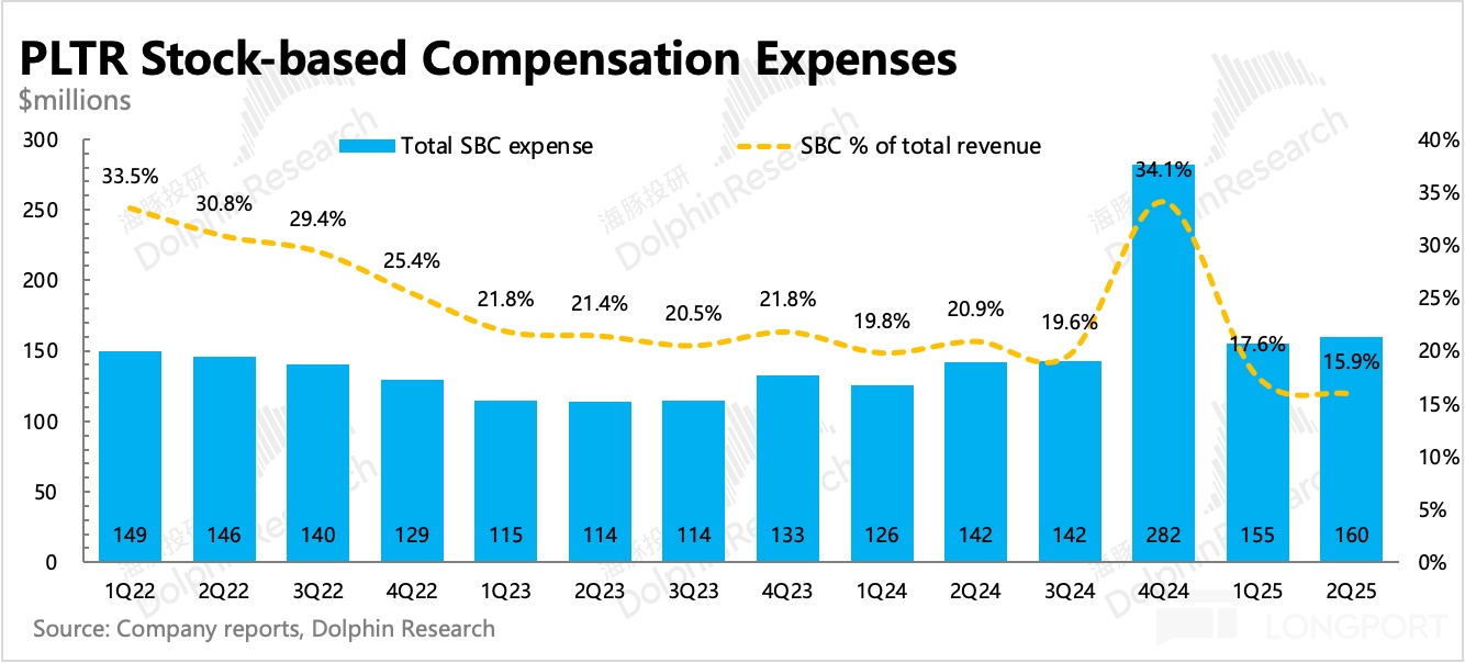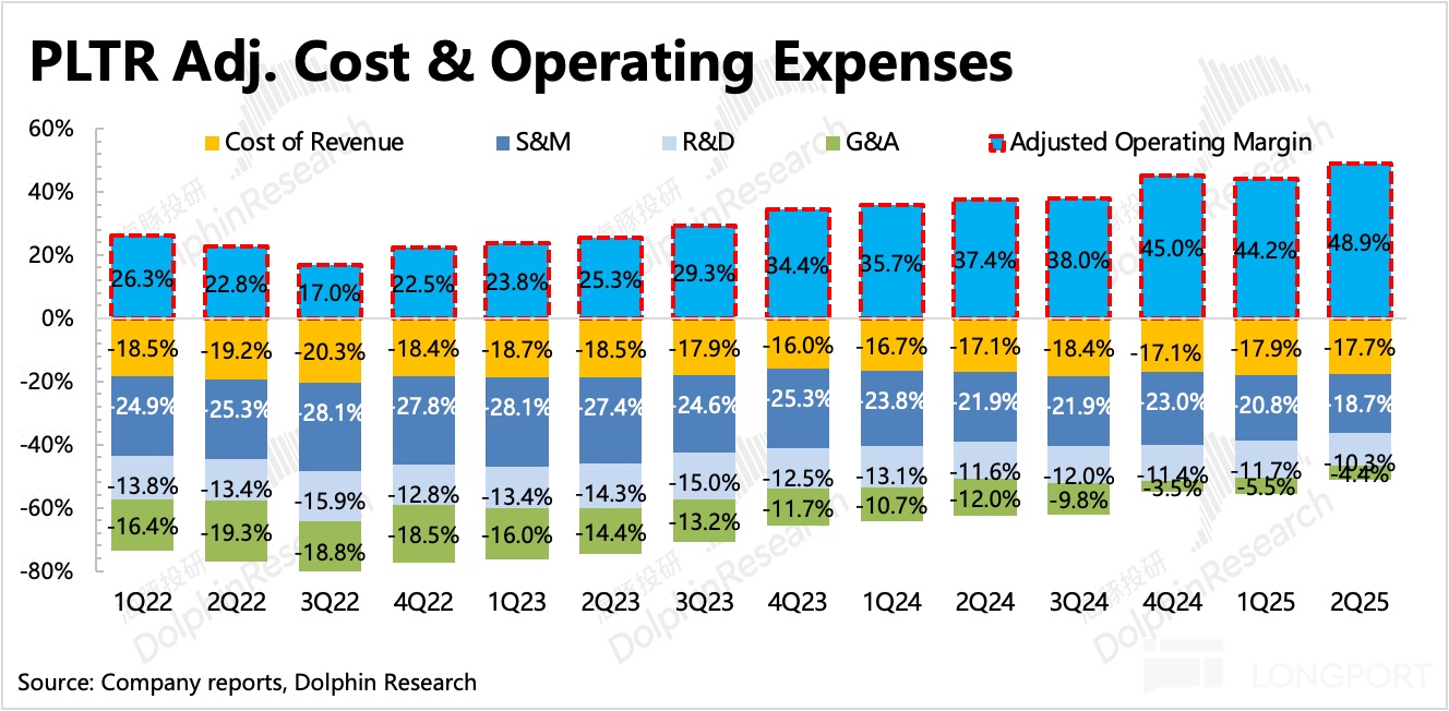二季度 Palantir 實現 GAAP 下經營利潤 2.7 億,三項經營費用繼續維持在 20% 左右的同比增長,但低於收入增速,因此利潤率提升。SBC 增幅不高,但同期市值爬升不少,因此可能在同步進行員工優化。最後經調整經營利潤率 48%,繼續改善。