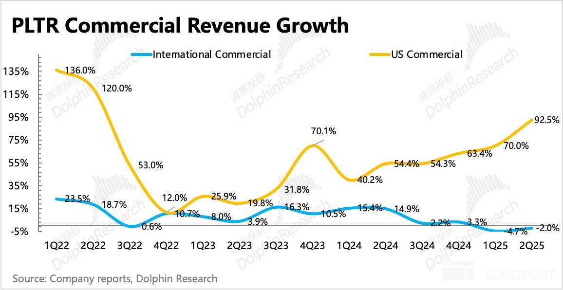 1. 美企需求旺盛:ToB 表現最關鍵,也是支撐 Palantir 估值的主要因素。二季度商業收入明顯加速增長,尤其是美國本地企業的需求,同比暴增 92%。