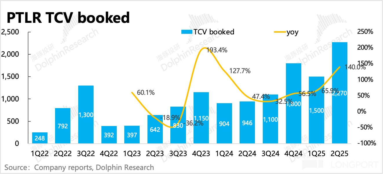 (1)中長期視角關注 TCV、RPO、客户數量:二季度 TCV(總合同價值)同比增速突然猛拉高到了 140%,除了美國地區一貫翻倍增長外,主要因為國際地區也因為幾筆大金額訂單,出現了爆發式增長——北約、英國國防部以及印尼能源企業等帶來的主要增量。