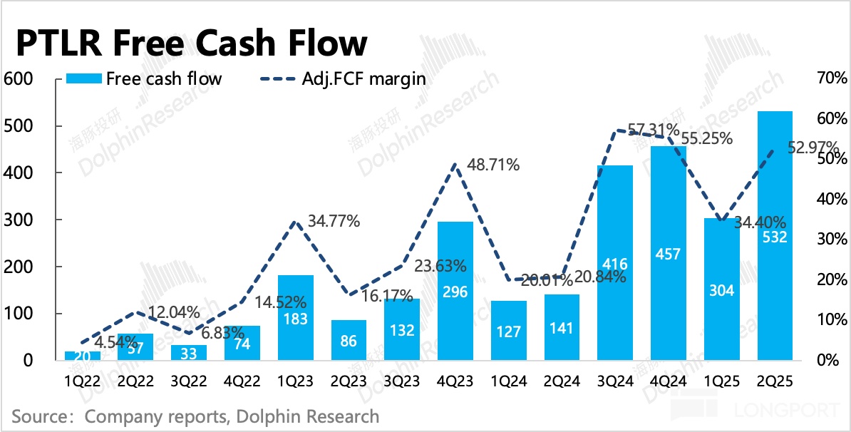 Palantir 的現金流與合同打款有關,因此會出現季節間的波動。二季度新增合同較多,流入的打款自然增加。管理層全年指引現金流 18-20 億,假設明年現金流仍有 40% 的增速,那麼當下 EV/ FCF=125x 的估值,也是隱含了太多積極預期。