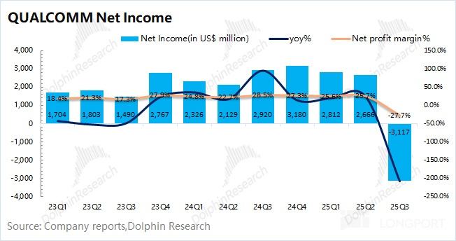 高通在 2025 財年第四季度(即 25Q3)淨利潤為-31 億美元,這主要是因為公司本季度進行了一筆 57 億美元的遞延税資產準備金。