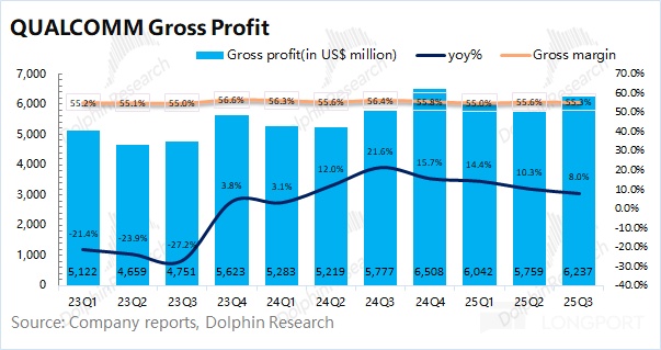 高通在 2025 財年第四季度(即 25Q3)實現毛利 62.4 億美元,同比增長 8%。