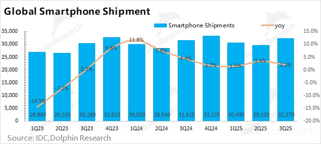 結合行業數據看,2025 年第三季度全球智能手機出貨量為 3.23 億台,同比增長 2.1%。行業面增速維持低個位數。在蘋果新機基礎版 “加量不加價” 的策略以及中國國補收緊的趨勢下,公司及安卓類在下一財年的表現都將面臨壓力。