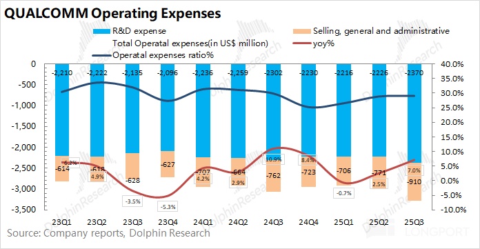 高通在 2025 財年第四季度(即 25Q3)的經營費用為 32.8 億美元,同比增長 7%。經營費用增速與收入增速相近,公司本季度經營費用率維持在 29.1%。