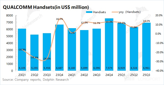 高通的手機業務在 2025 財年第四季度(即 25Q3)實現營收 69.6 億美元,同比增長 14.2%,好於市場預期(63.1 億美元)。手機業務超預期,主要來自於今年公司旗艦新品——驍龍 8 Elite Gen5 提前發佈的影響。