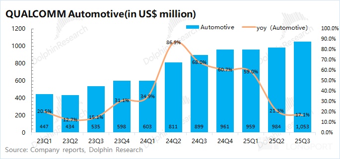 高通的汽車業務在 2025 財年第四季度(即 25Q3)實現營收 10.5 億美元,同比增長 17%,略好於市場預期(10.2 億美元),主要是受 Snapdragon 數字底盤出貨增加的帶動。
