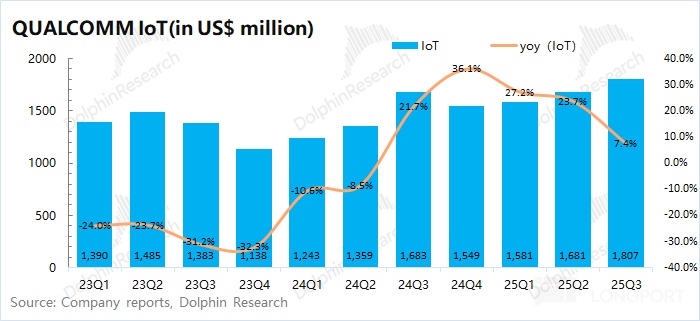 高通的 IoT 業務在 2025 財年第四季度(即 25Q3)實現營收 18 億美元,同比增長 7.4%,好於市場預期(17 億美元)。在經歷連續 4 個季度兩位數增長後,本季度 IoT 業務回落至個位數。