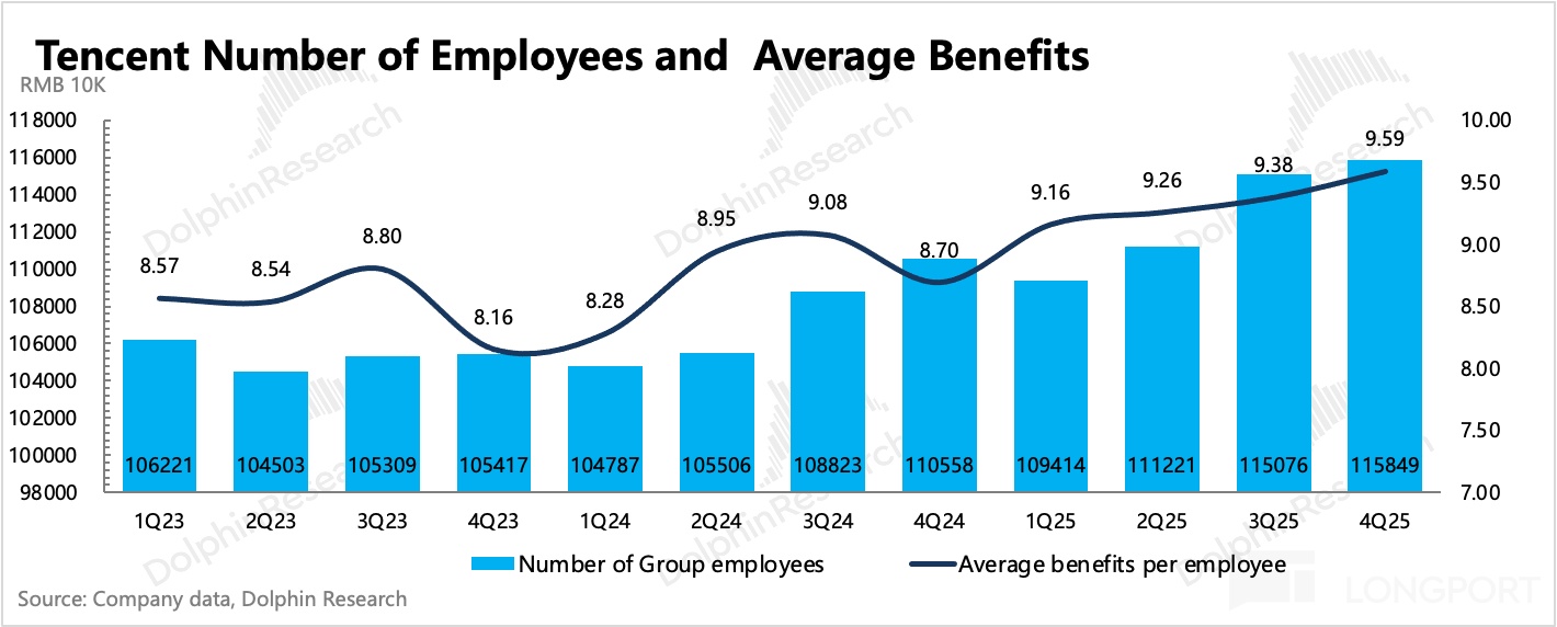 未來短中期的利潤率變動可能會受到持續的投入所影響,雖然蘋果税調整有利於騰訊增值服務毛利率的改善,但 AI 投入也會逐步體現到折舊成本、算力租賃費用上,以及短期可能也會有研發人員成本增加(公司上季度表態 AI 提效不傾向裁員而是做業務創收的增加,因此預計不會出現短期大力度裁員而是控制人員增量,Q4 員工淨增 773 人相比上季度就有明顯減少),中長期才可能會因為整體經營效率提升而對利潤率起到正面推動。