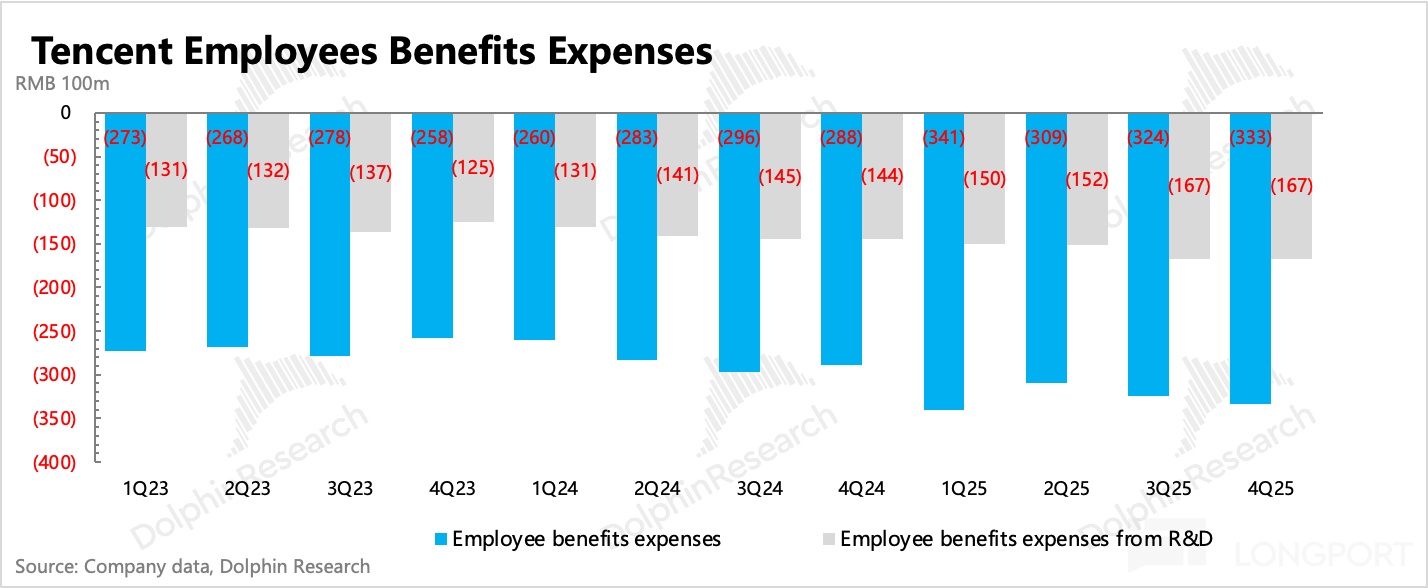 四季度單看推廣費用同比增長 44%,環比多花了 15 億。除了少量新遊戲宣發外,應該就是主要用於元寶買量了,顯然 Q1 銷售費用只會更高。其他支出增長較多的,主要還是和 AI 相關的服務器費用以及研發人員成本。
