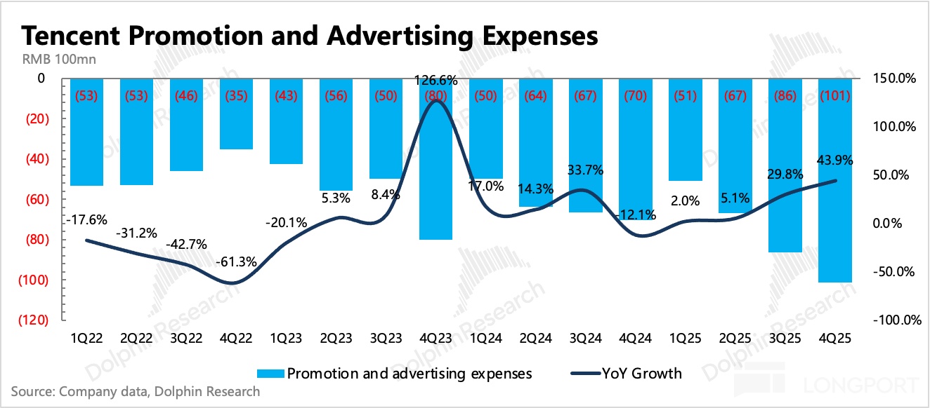 4. 成本優化,費用增加:最終利潤率提升趨勢不變,經營利潤率同比提高 2pct。但當季在元寶等 AI 產品上的宣發開支體現得比較明顯,單看推廣費用同比增長 44%,環比多花了 15 億。除了少量新遊戲宣發外,應該就是主要用於元寶買量了,顯然 Q1 銷售費用只會更高。