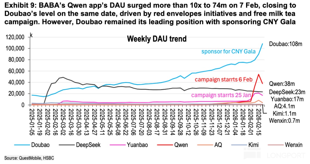 AI chatbot 上,元寶 app 下載量在今年年初的營銷活動下有明顯反彈,但千問來勢洶洶,配合外賣紅包等場景服務,經過春節之後目前用户規模已經高於元寶。豆包則仍是翹楚,春晚的贊助又拉了一大波流量。