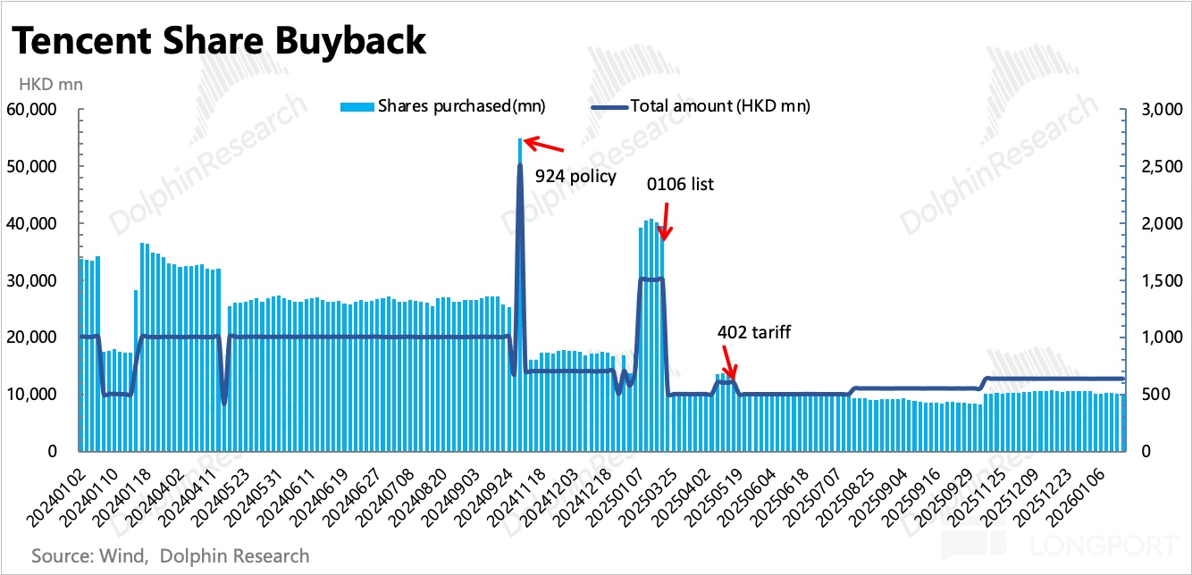 公司自身回購上,四季度回購近 200 億港元,環比小幅下降。從日均回購規模來看,上季度財報發佈之後恢復回購此次靜默期之前,每日回購金額提高至 6.35 億 HKD 左右,要比之前的 5.5 億明顯多了一些。近期股價回調較多,就算今年資金配置上投入為主,那財報後恢復回購,短期上預計也會保持高力度。