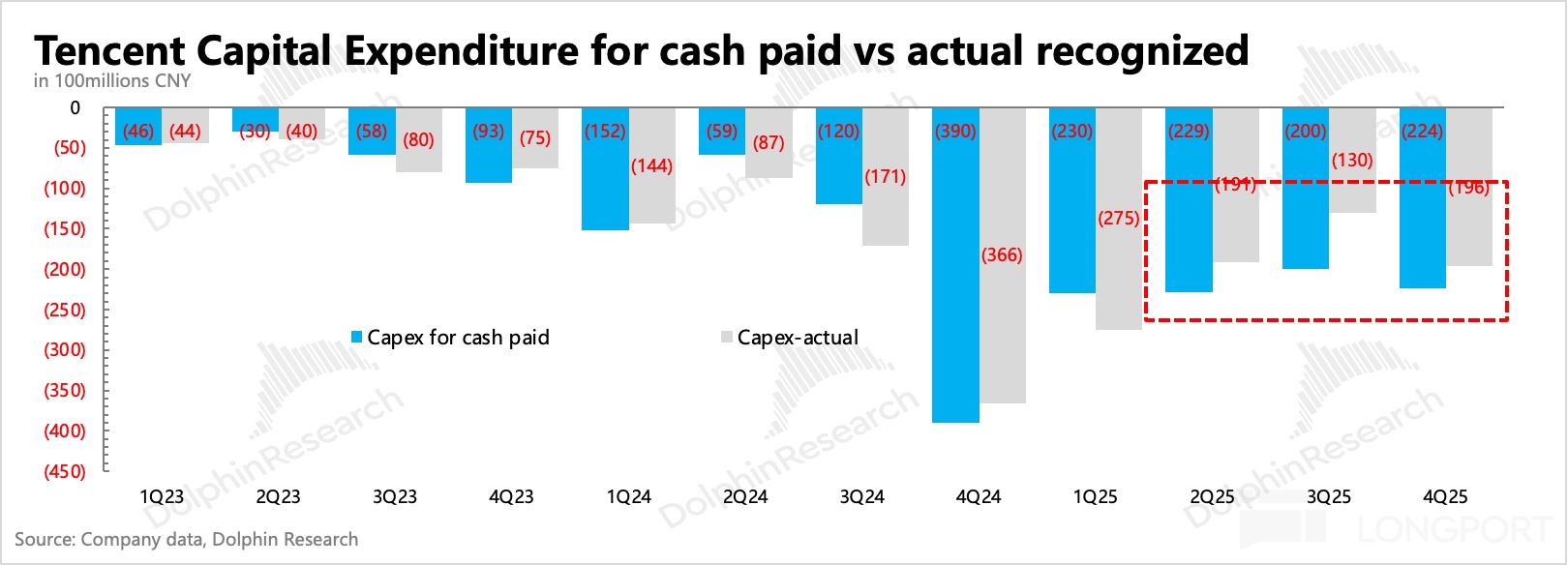 6. 投入增加或壓縮股東回報預期:關於現金流和資金配置,海豚君重點看資本投入和回購情況。Q4 賬上淨現金 1071 億(現金 + 短期投資扣除短期借款和應付票據),環比淨增近 50 億。本季度資本開支 196 億,環比有所增加。但實際現金流出 224 億,同樣存在預付的問題。不過就算是看現金流出規模,2025 全年 Capex 也不足 900 億,反過來看今年預算增長就會比較明顯了。