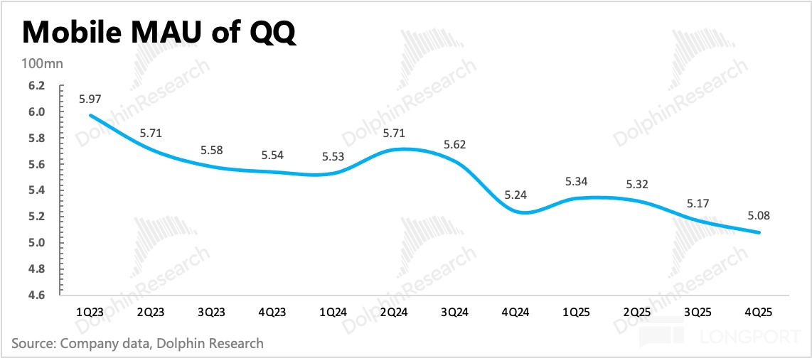 四季度微信用户 14.18 億,環比淨增 400 萬,穩定擴張但節奏放緩。QQ 沒啥好説的,繼續下滑。