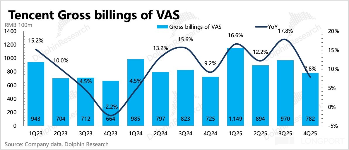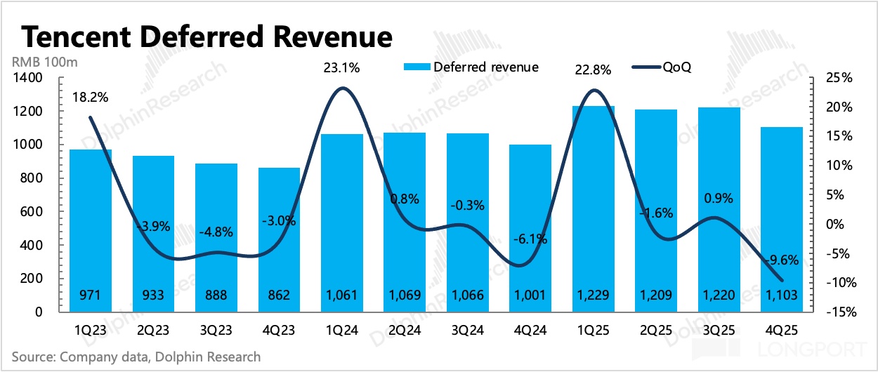 遞延收入看,Q4 增值服務流水環比下降 10%,下降幅度要比往年更大一些。這裏除了有音樂付費降速、視頻付費直接拖累等影響外,遊戲自身流水應該是正常表現。