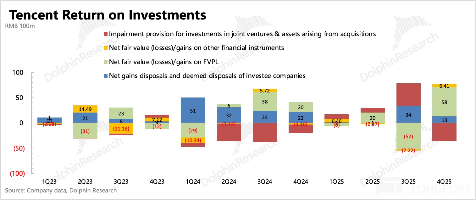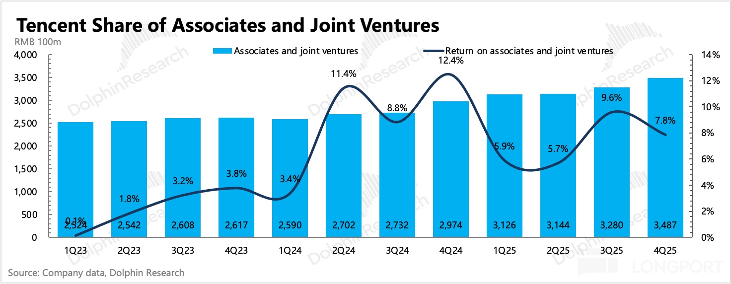 截至四季度末,公司聯合/合營資產規模合計 3487 億,計算得騰訊的投資收益率為 7.8%(年化),環比三季度季度有所下降。