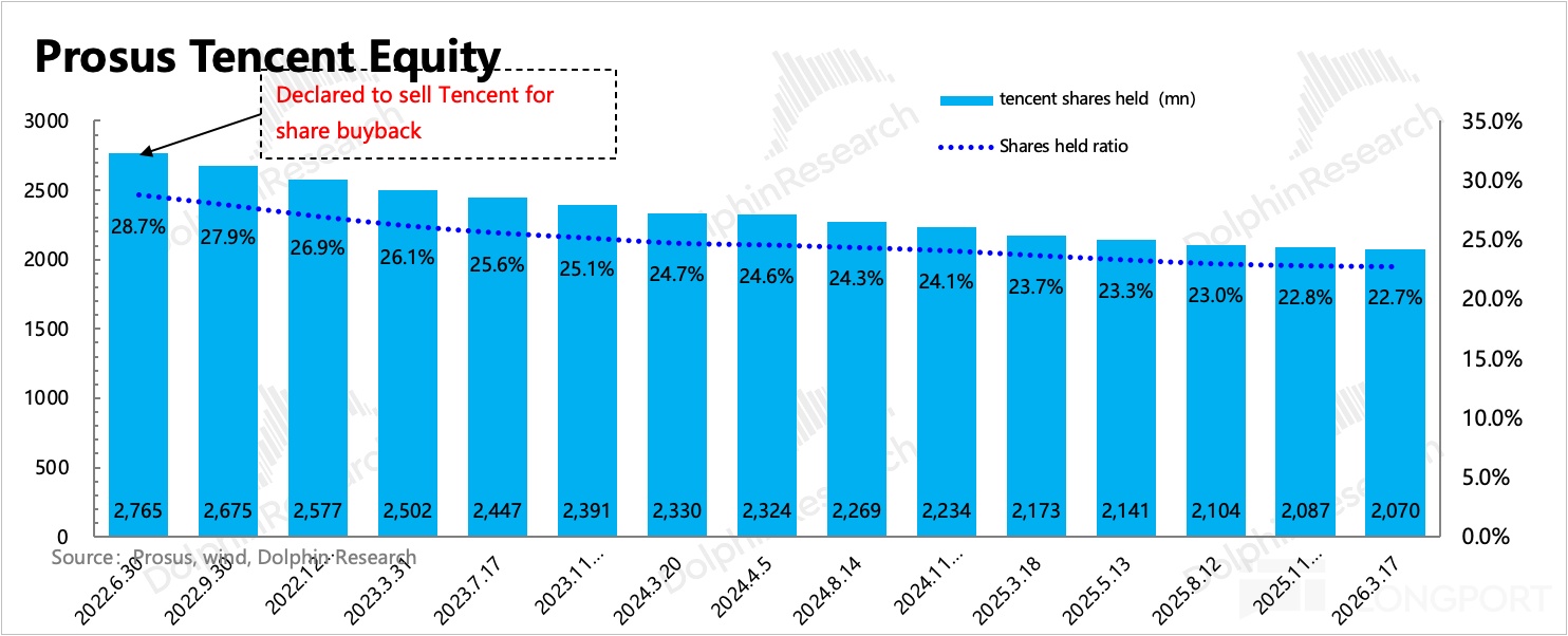 從上次財報披露至今的 4 個月,騰訊總股數淨減少 3900 萬股。但同期大股東減持力度仍然與上季度持平,相比以往力度放緩。月均拋售量繼續下降,總拋售 1600 萬股。截至昨日,Prosus 在騰訊中的股權佔比降至 22.74%,環比上季度財報發佈日減少 0.08pct。