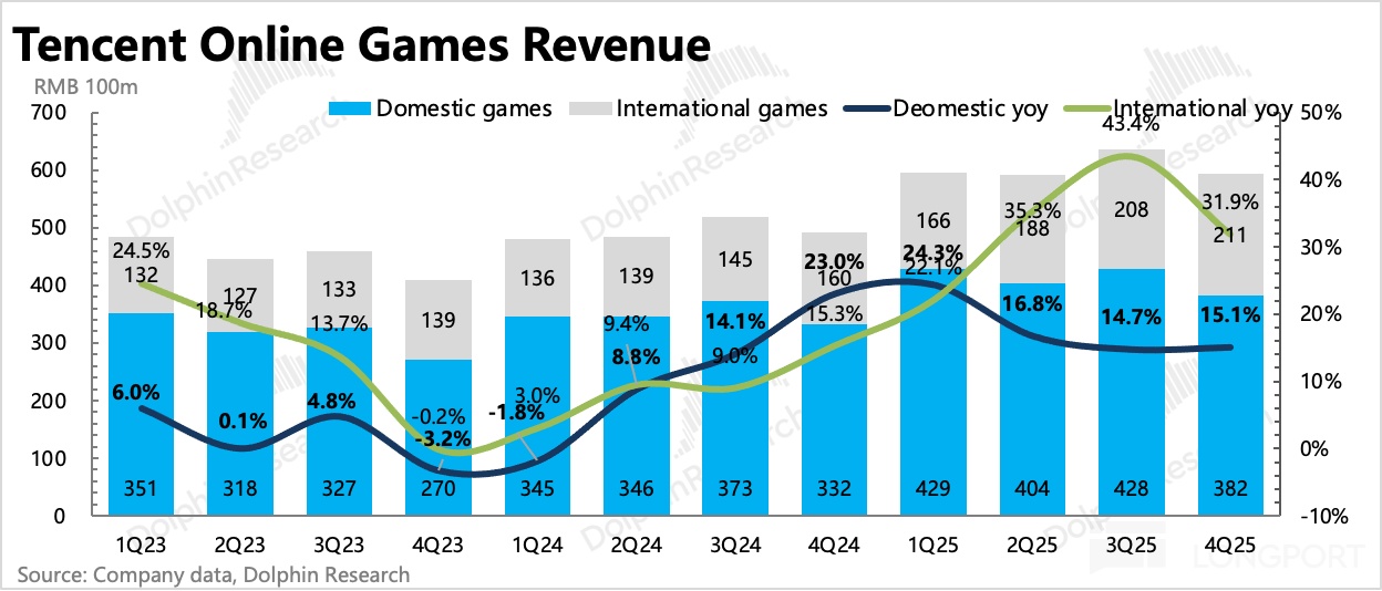 四季度網絡遊戲收入 593 億,同比增長 21%,其中國內增長 15%,海外增長 32%(匯率順風大約 1pct)。
