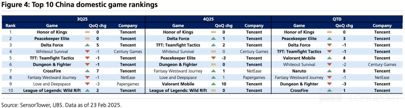 由於當季沒有發重要的新遊戲,因此本土增量主要來自於前一年內上線的新遊如《無畏契約手遊》、《三角洲行動》、《鳴潮》。