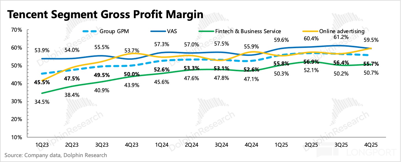 其他支出增長較多的,主要還是和 AI 相關的服務器費用以及研發人員成本。整體經營費用率同比繼續提升 0.5pct,但被毛利率改善對沖了。三大業務毛利率均有不同程度的提高,背後原因包括自研遊戲佔比增加(減少分成)、視頻號廣告佔比提高等因素推動。