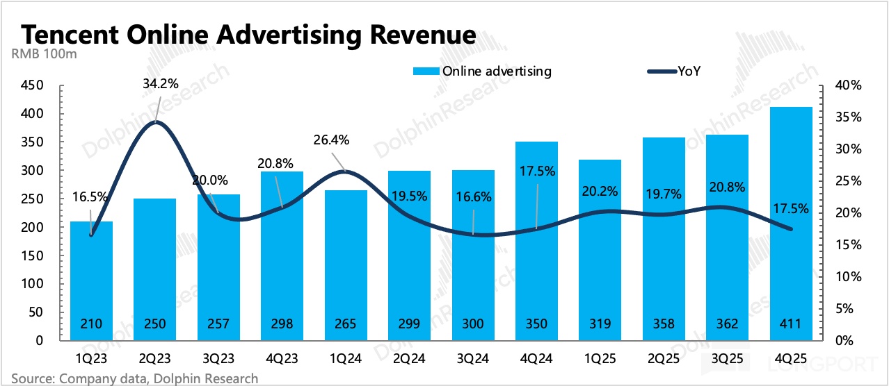 2. 廣告有所放緩,庫存仍有釋放空間:廣告 Q4 增速 18%,環比降速 3pct。除了小部分的高基數影響,增長放緩應該也受到了消費環境低迷的影響。根據海豚君的調研,四季度廣告中視頻號、小遊戲、搜索以及騰訊音樂的廣告都還可以,但微信中的公眾號下滑較多,此外媒體廣告部分的 QQ、搜狗、騰訊新聞繼續拖累。