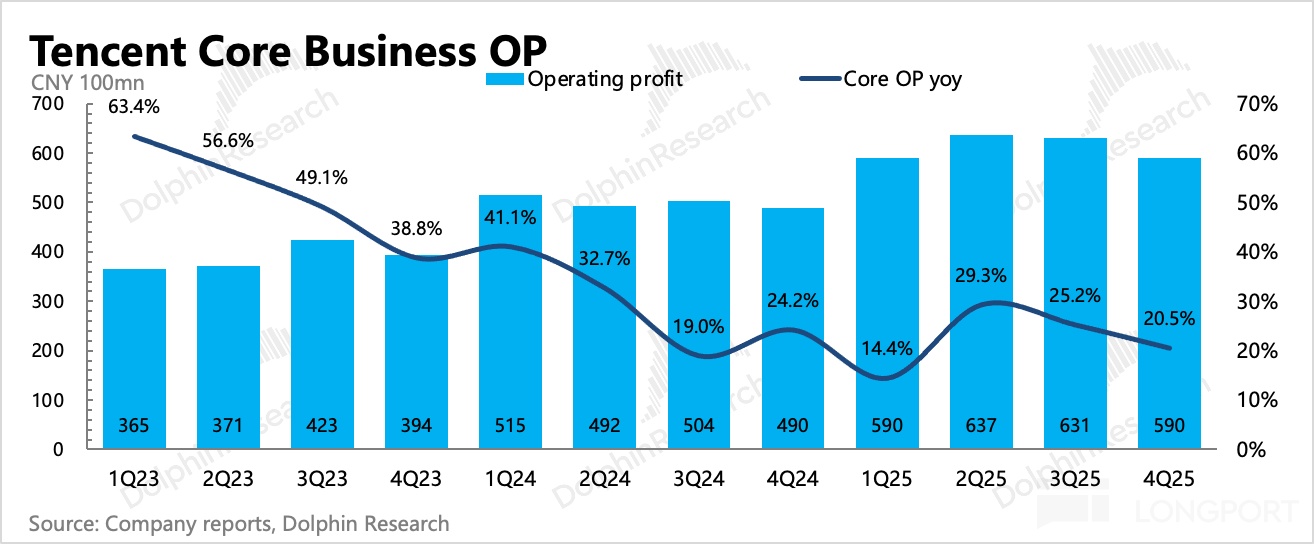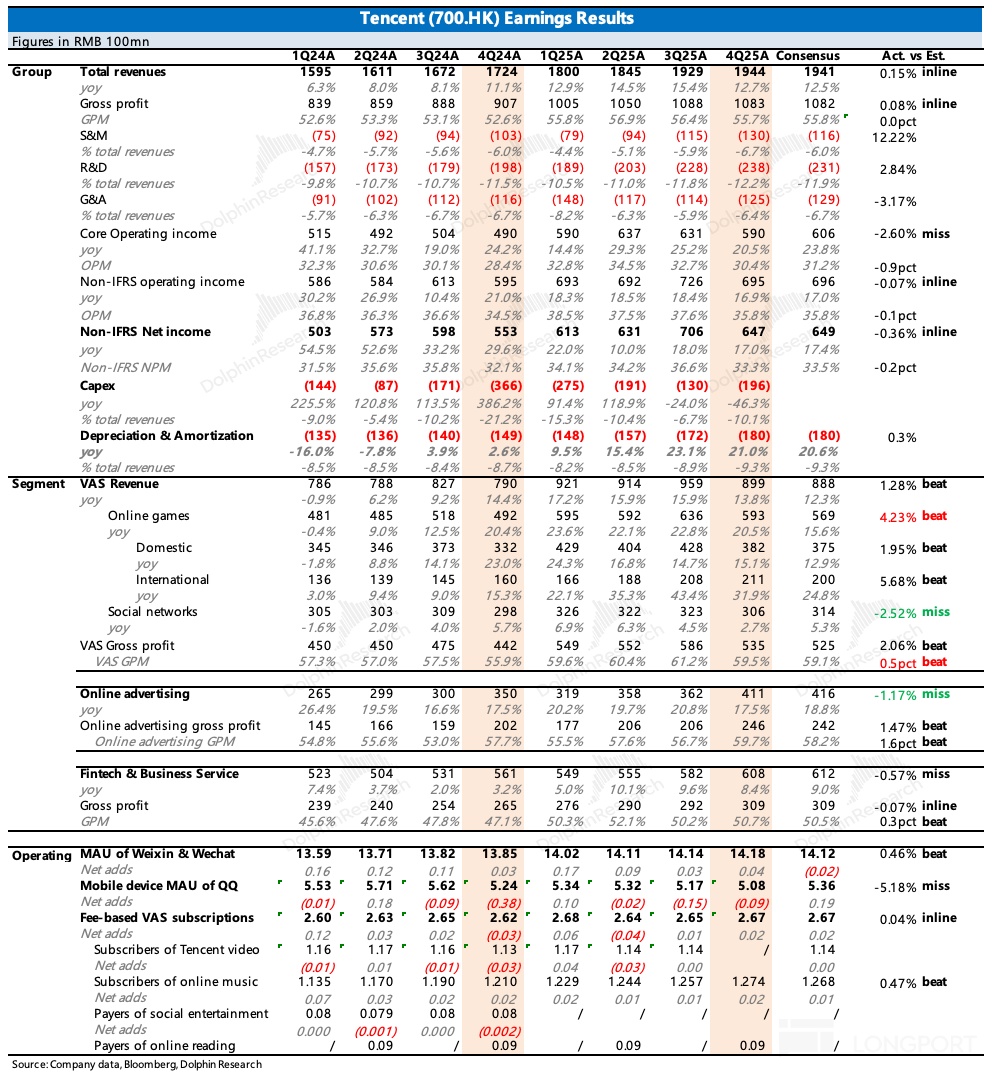 騰訊發佈了 2025 年四季度業績。整體看無驚無喜,細項上與預期略有差距。相比於當期業績,在當下比較關鍵的 AI 變革窗口期,管理層如何指引今年的業務投入和增長預期,對中期的估值影響更加關鍵。