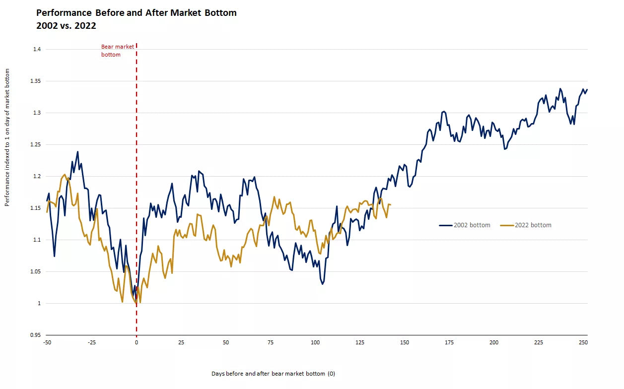 (該圖表顯示了標準普爾 500 指數在 2002 年和 2022 年市場觸底前 50 天和触底後 250 天的表現。到目前為止,該指數自 2022 年觸底以來的表現與 2002 年觸底後的市場表現相當。)