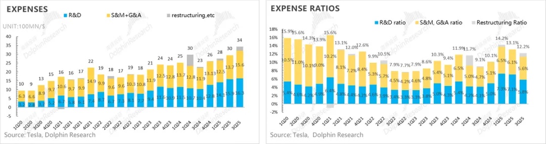 4、研發費用 + 資本開支的狂投都仍然在為 AI 的星辰大海業務買單:特斯拉本季度研發開支和銷售費用又在繼續加大,研發費用 16.3 億,高於市場預期 15.4 億,仍然由於 AI 智能化投入的繼續加大,特斯拉向從事 AI 計劃的員工授予了股權激勵,以及研發費用主要用於 HW5.0 芯片,Robotaxi 和 Optimus 的投入,特斯拉也指引研發費用支出在未來將繼續增加。