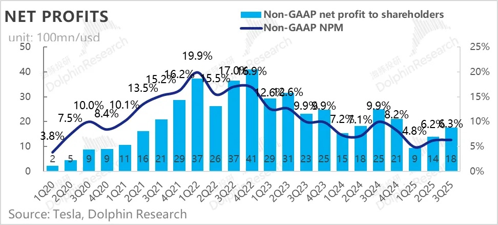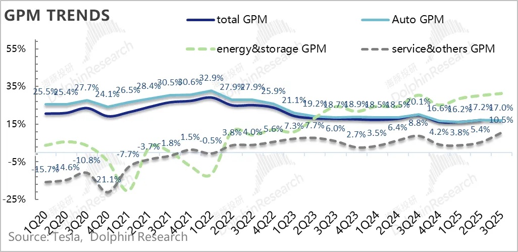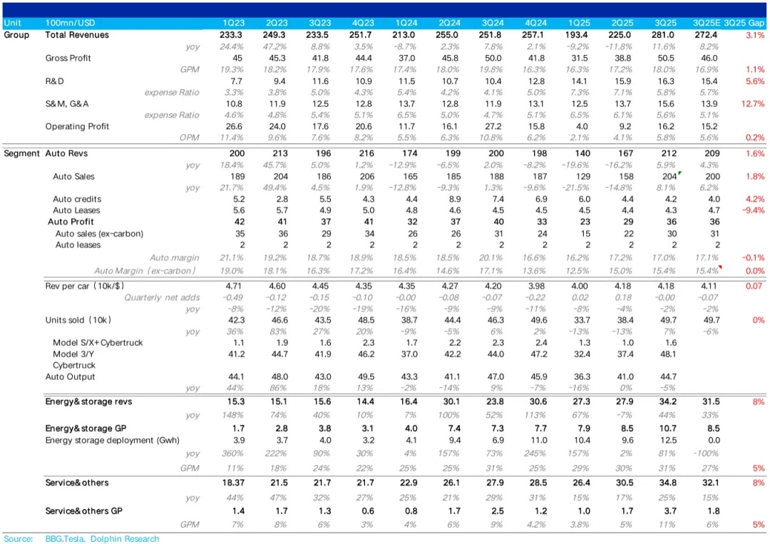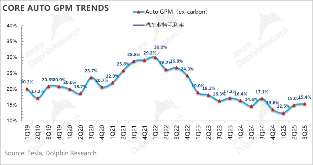 同時由於四季度銷量的環比下滑,純毛利的碳排放積分的繼續下滑,以及關税成本對賣車的影響也會在四季度影響繼續顯現,四季度特斯拉賣車的毛利率預計繼續呈現承壓趨勢。