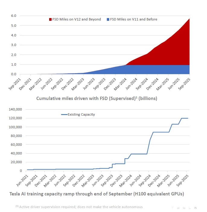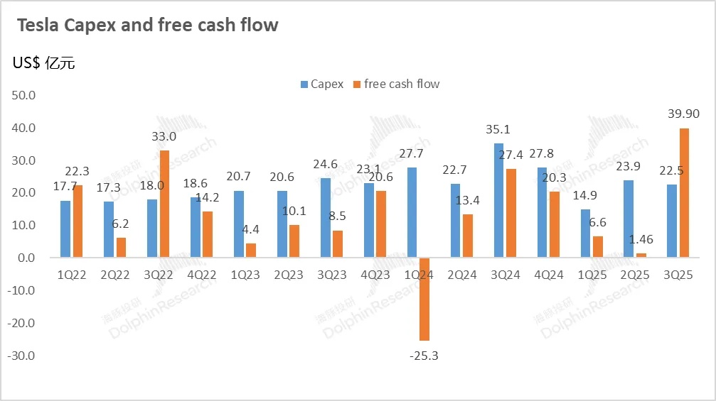 而資本開支本季度雖然環比上季度略有下行,但特斯拉指引今年的資本開支投入將達到 90 億美元,隱含四季度資本開支 28.7 億美元,環比本季度 22.5 億還要在增長 6.2 億美元,為 FSD 功能的再次大幅迭代,以及 Robotaxi 的商業化擴展做準備,同時 2026 年的資本開支指引還要再大幅增加。