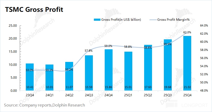 台積電在 2025 年第四季度實現毛利 210 億美元,環比增長 6.8%。其中毛利率 62.3%,環比提升 2.8pct,產品均價持續提升是毛利率向上的主要因素。