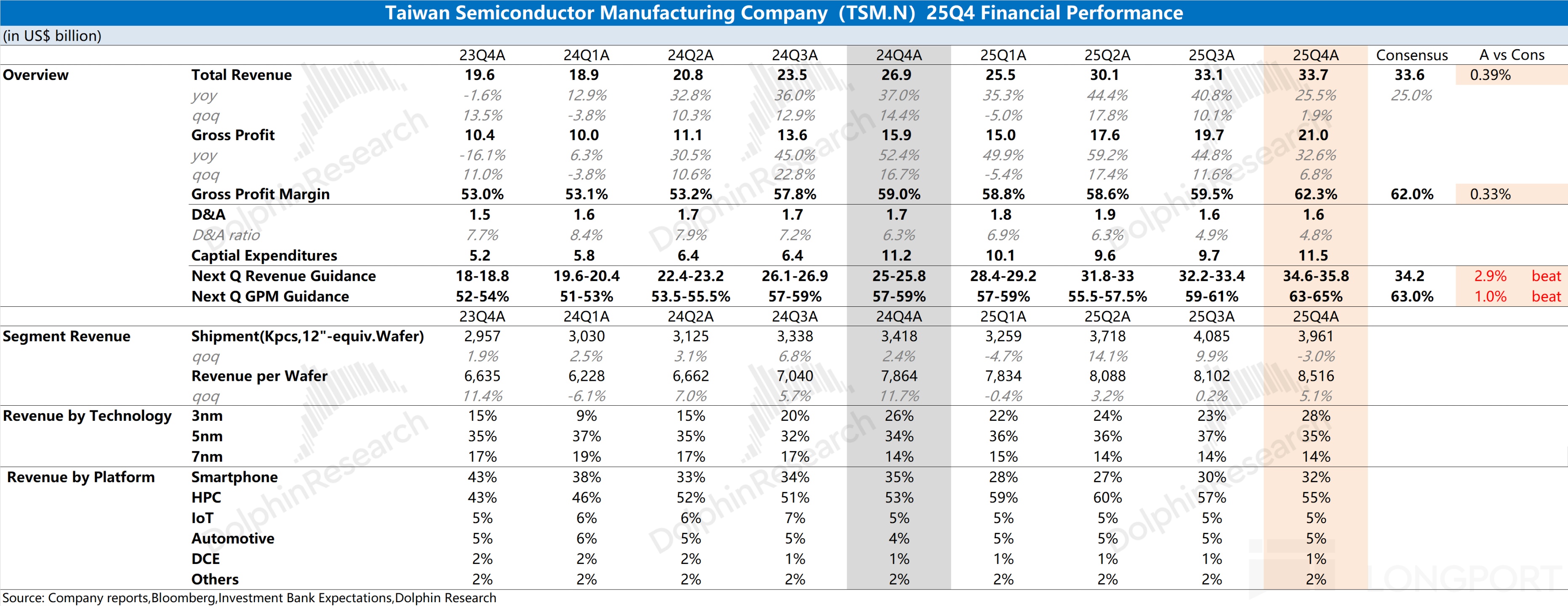 b.下游應用端:公司本季度收入環增主要來自於手機業務,因 iPhone 新機出貨。在英偉達、博通等 AI 芯片需求的影響下,高性能計算依是公司最大的收入來源,本季度達到 185.5 億美元,收入佔比 55%。