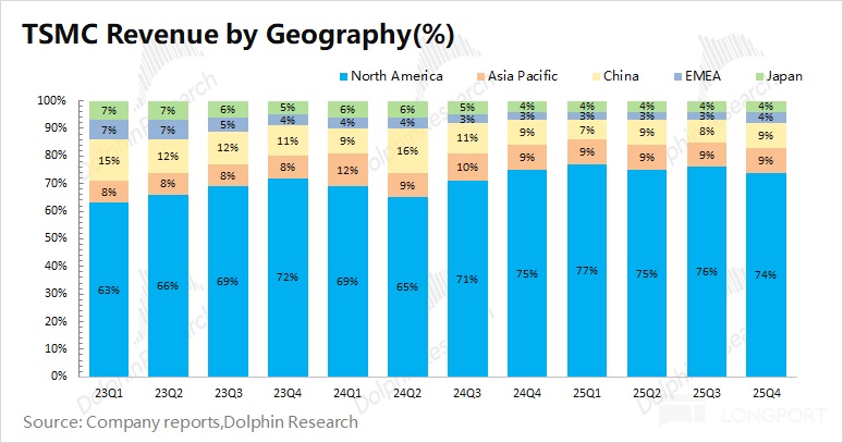 從各地區收入來看,北美地區仍是台積電最大的收入來源,收入佔比為 74%。這是由於北美地區有蘋果、英偉達、AMD、高通等大客户,使得台積電和美國之間有很強的商業綁定關係。