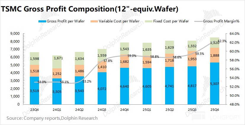 3)可變成本(其他製造費用):本季度台積電平均可變成本約 1888 美元/片,環比減少 64 美元/片。以台幣口徑看,單位可變成本基本持平,變動主要受美元升值影響。