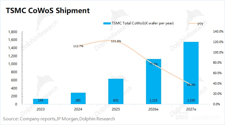 結合行業數據及市場預期,台積電當前 CoWoS 的月產能約 7 萬片左右,至 2026 年末有望擴大至 12 萬片左右。海豚君預估 2026 年台積電 CoWoS 的出貨量有望達到 110 萬片以上,同比增長 77%,其中英偉達、AMD 和博通是最主要的客户。