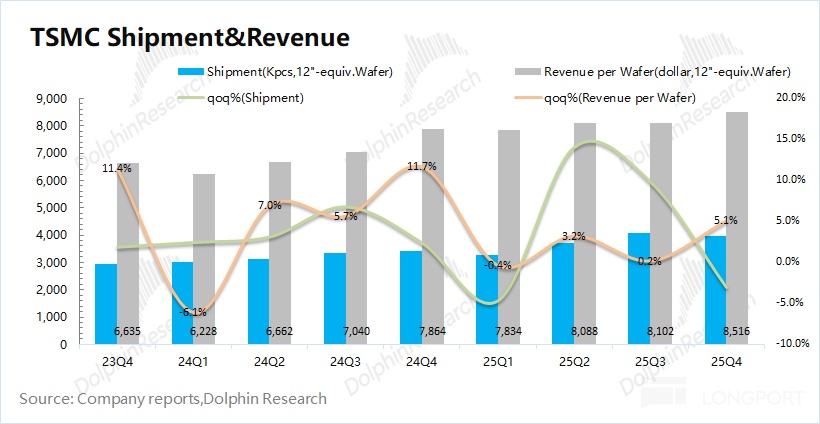 從量價關係看(等效 12 寸片):①台積電的晶圓出貨量 3961 千片,環比下滑 3%;②台積電的晶圓單晶圓收入(等效 12 寸片)8516 美元/片,環比增長 5.1%。