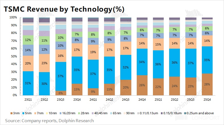 a.分製程看:台積電本季度 7nm 以下先進製程的佔比提升至 77%,又創新高。受 AI 需求的推動,公司當前 3nm 和 5nm 產能已經滿載,兩項收入佔比分別為 28% 和 35%。隨着公司 2nm 量產,AI 芯片將從 5nm 往 3nm 轉移,公司收入結構將進一步向先進製程傾斜。