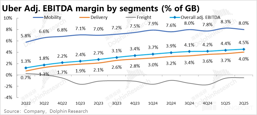 3)Uber 在費用管控上的效果依舊出色,在繼續釋放利潤率。不過趨勢上,近 2~3 個季度 adj.EBITDA 利潤率提升的速度在逐漸放緩。後續利潤增長可能會進一步向營收增速靠攏。