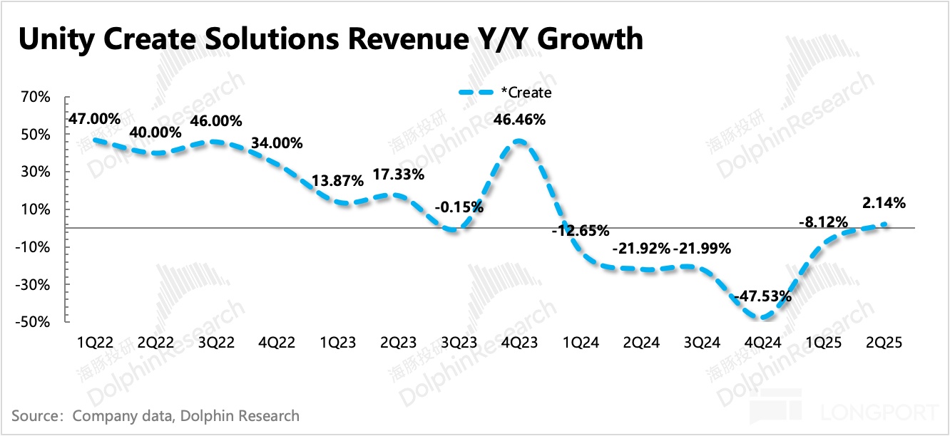 新的 Create 解決方案包含了原先 Create 下的產品(遊戲主引擎)外,還加入了原先確認在 Operate 中的 UGS 收入(Unity Game Service:針對遊戲公司的全鏈條解決方案,幫助解決遊戲開發、發行、獲客運營的一攬子方案)、原 Strategy 的收入,但 2023 年起逐步關閉 Profession service、Weta 等產品服務;