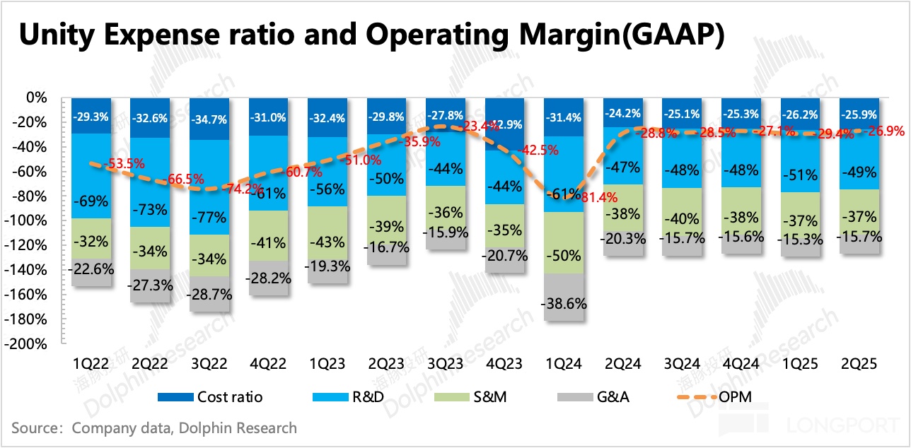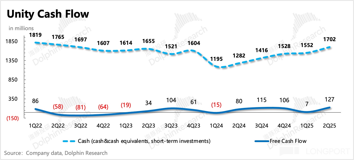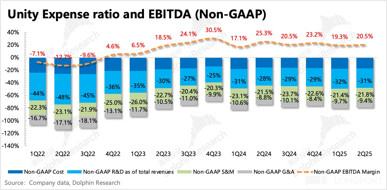 GAAP 經營費用同比下滑 5%,其中 SBC 股權激勵同比增長 20%,應該主要由市值提高帶來(二季度 Unity 市值增長近 50%)。最終 GAAP 經營虧損 1.18 億,經調整的 EBITDA 實現 0.91 億,利潤率 21%,超出公司指引(0.7-0.75 億)和市場預期(0.76 億)。