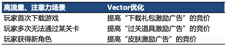 為了具化這個過程,海豚君舉幾個例子,比如在以下幾個玩家注意力相對集中的場景下(意味着潛在的 ROAS),Vector 會自動提高廣告位的競價,改善廣告位提供方的變現。反之在低流量場景下廣告位,則降低競價,為廣告買方節約成本。