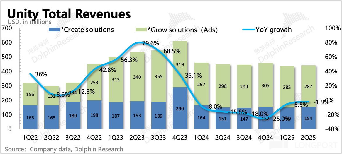 Unity 在 2023 年一季度併入了 IronSource 經營情況,並且對細分業務的劃分範圍也進行了調整。新的披露結構下,分部業務從原來的三個(Create、Operate、戰略)濃縮成兩個(Create、Grow)。