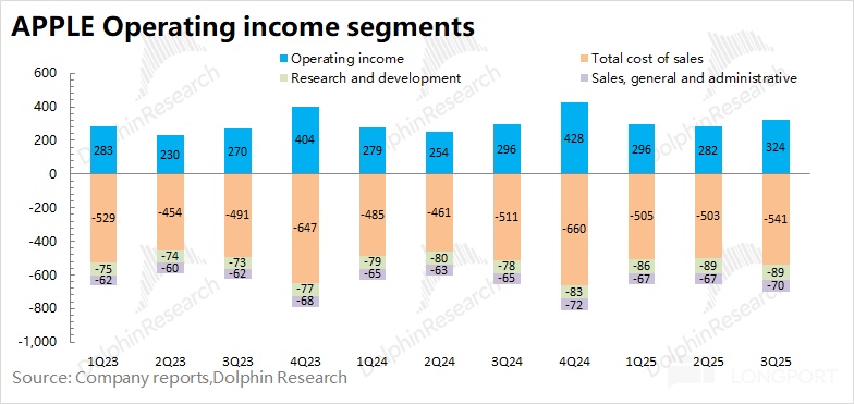 1.3 经营利润:2025 财年第四季度(即3Q25)苹果公司经营利润324 亿美元,同比增长9.6%。苹果公司本季度经营利润的增长,是受收入增长和毛利率提升的共同带动。