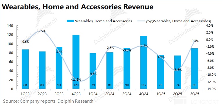2025 财年第四季度(即3Q25)可穿戴等其他硬件业务收入90 亿美元,同比下滑0.3%,好于市场预期(86.4 亿美元)。可穿戴及其他业务,在本季度基本止住了连续九个季度以来的下滑。
